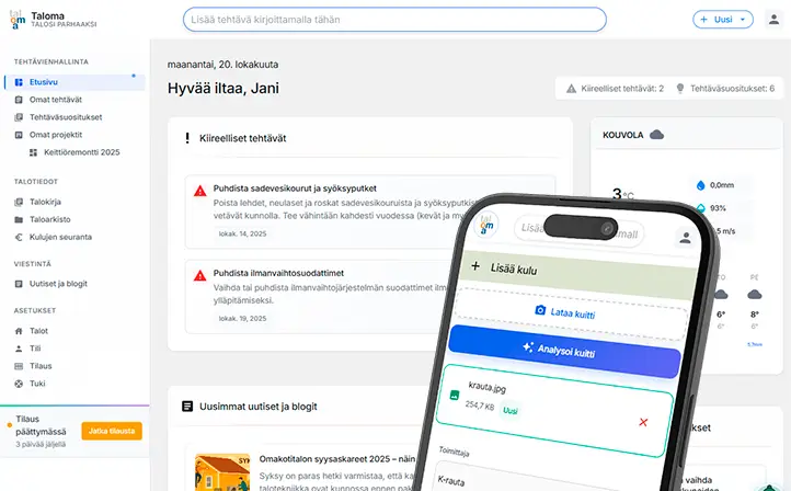 Parasta on se, ettei tarvitse muistaa milloin mikäkin pitää tehdä. Taloma muistuttaa sinua oikeaan aikaan kaikesta – kourut syksyllä, lämmitykset ennen talvea, mökin avaus keväällä. Taloma osaa ajoittaa huollot vuodenajan ja sään mukaan, esimerkiksi muistuttaa vesipostien sulkemisesta ennen pakkasia.